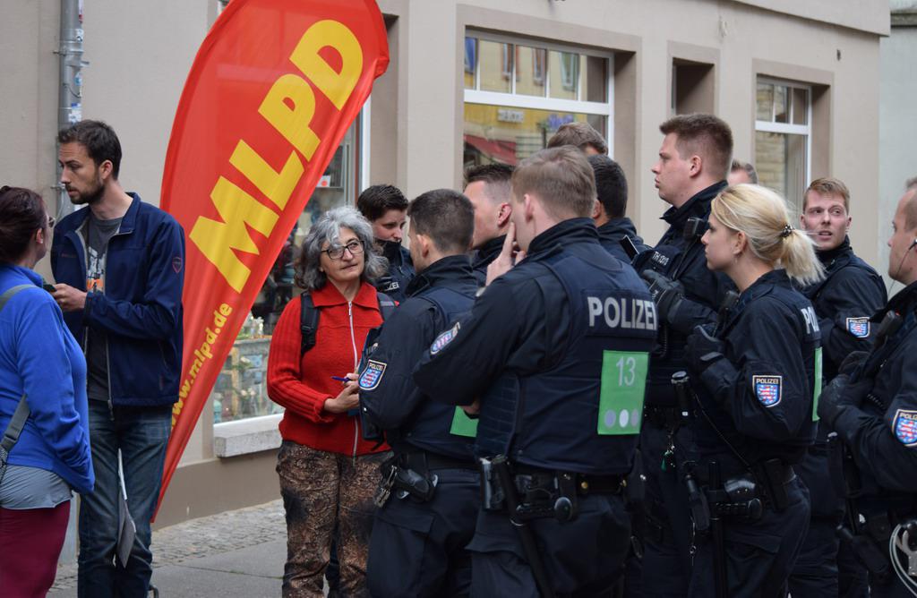 This whole affair was no mere slip. Through various state measures like the Police Duties Act in Bavaria as a blueprint for North Rhine-Westphalia, Lower Saxony and nationwide, the state apparatus is enabled to apply emergency and preventive measures like preventive detention, elimination of democratic rights or collaboration between police and secret service. In Bavaria tens of thousands have already demonstrated against this and hundreds of thousands have voiced their protest. The people increasingly notice that this fascistization of the state apparatus is directed against themselves. The resistance movement, as it is developing in Bavaria, in the protests of the refugees in Ellwangen or against the attacks on the MLPD, is an expression of a now increasing progressive change of mood. The MLPD demands the investigation of the occurrences by the Thuringia state parliament, the punishment of those responsible, and compensation for damages. Police inspector Löther and the responsible Minister of the Interior, Seehofer, must resign!