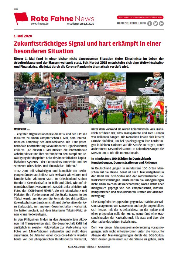 Vordergrundbild z.B. ein Screenshot des Flugblattes Hintergrundbild z.B. ein Foto 319 * 177 Pixel breit Text kurzer Anreißer z.B. "Erklärung des Zentralkomitees der MLPD: Aktiver Widerstand gegen imperialistische Kriegsvorbereitung!" 1. Mai 2020: Zukunftsträchtiges Signal und hart erkämpft in einer besonderen Situation Buttontext z.B. "Flugblatt lesen" Flugblatt lesen Buttonlink z.B. "2018/kw14/dieses-flugblatt-in-pdf-format-in-farbe" 2020/05/flyer_rf_news-zusammenfassung-1-mai.pdf Inhalte Dieser Ordner hat zur Zeit keinen Inhalt.