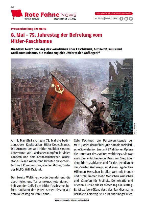 Vordergrundbild z.B. ein Screenshot des Flugblattes Hintergrundbild z.B. ein Foto 319 * 177 Pixel breit Text kurzer Anreißer z.B. "Erklärung des Zentralkomitees der MLPD: Aktiver Widerstand gegen imperialistische Kriegsvorbereitung!" 8. Mai – 75. Jahrestag der Befreiung vom Hitler-Faschismus Buttontext z.B. "Flugblatt lesen" Flugblatt lesen Buttonlink z.B. "2018/kw14/dieses-flugblatt-in-pdf-format-in-farbe" 2020/05/presseerklaerung-zu-8-mai.pdf Inhalte Dieser Ordner hat zur Zeit keinen Inhalt.