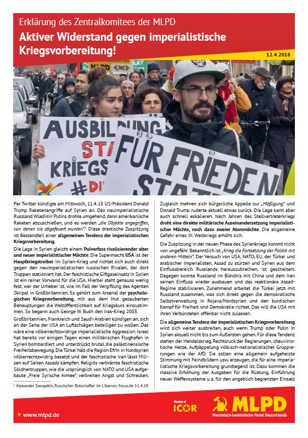 Vordergrundbild z.B. ein Screenshot des Flugblattes Hintergrundbild z.B. ein Foto 319 * 177 Pixel breit Text kurzer Anreißer z.B. "Erklärung des Zentralkomitees der MLPD: Aktiver Widerstand gegen imperialistische Kriegsvorbereitung!" Aktiver Widerstand gegen imperialistische Kriegsvorbereitung! Buttontext z.B. "Flugblatt lesen" Flugblatt lesen Buttonlink z.B. "2018/kw14/dieses-flugblatt-in-pdf-format-in-farbe" 2018/kw02/aktiver-widerstand-gegen-imperialistische-kriegsvorbereitung.pdf Inhalte Dieser Ordner hat zur Zeit keinen Inhalt.