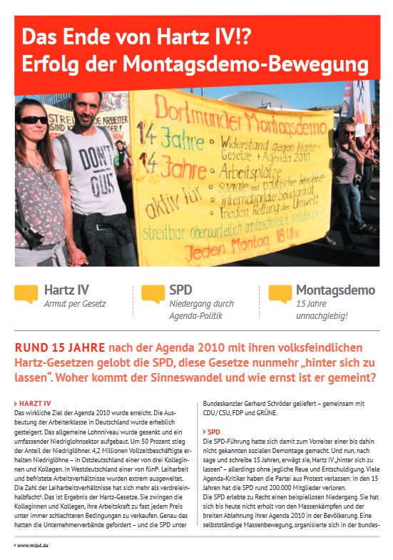 Vordergrundbild z.B. ein Screenshot des Flugblattes Hintergrundbild z.B. ein Foto 319 * 177 Pixel breit Text kurzer Anreißer z.B. "Erklärung des Zentralkomitees der MLPD: Aktiver Widerstand gegen imperialistische Kriegsvorbereitung!" Das Ende von Hartz IV!? Erfolg der Montagsdemo-Bewegung Buttontext z.B. "Flugblatt lesen" Flugblatt lesen Buttonlink z.B. "2018/kw14/dieses-flugblatt-in-pdf-format-in-farbe" 2019/03/das-ende-von-hartz-iv-erfolg-der-montagsdemo-bewegung Inhalte Dieser Ordner hat zur Zeit keinen Inhalt.
