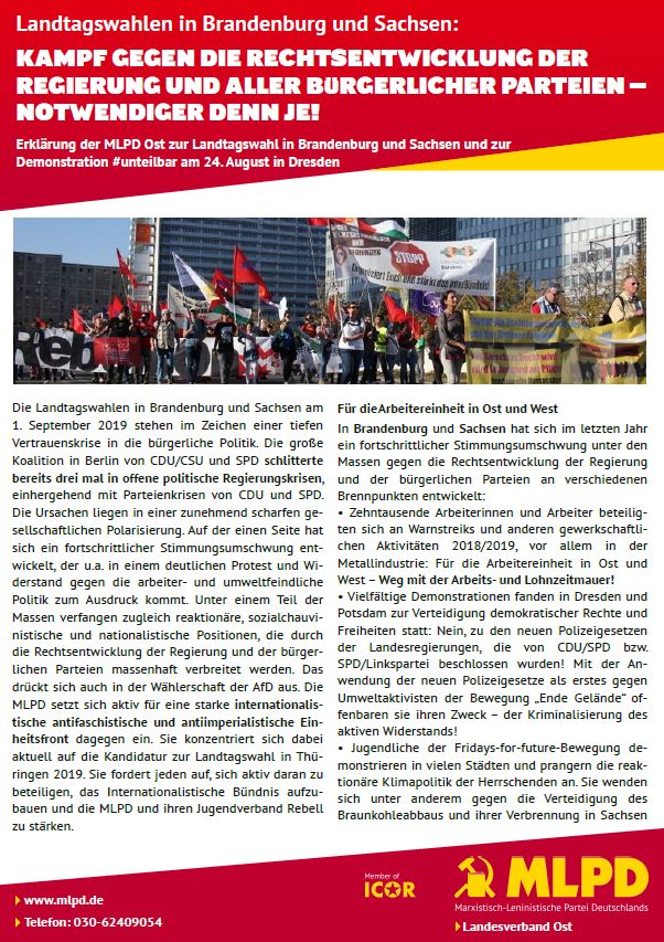 Vordergrundbild z.B. ein Screenshot des Flugblattes Hintergrundbild z.B. ein Foto 319 * 177 Pixel breit Text kurzer Anreißer z.B. "Erklärung des Zentralkomitees der MLPD: Aktiver Widerstand gegen imperialistische Kriegsvorbereitung!" Erklärung der MLPD-Landesleitung Ost zur Landtagswahl in Brandenburg und Sachsen Buttontext z.B. "Flugblatt lesen" Flugblatt lesen Buttonlink z.B. "2018/kw14/dieses-flugblatt-in-pdf-format-in-farbe" 2019/08/landtagswahl_brandenburg_sachsen.pdf Inhalte Dieser Ordner hat zur Zeit keinen Inhalt.