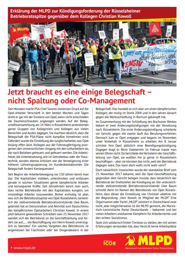 Vordergrundbild z.B. ein Screenshot des Flugblattes Hintergrundbild z.B. ein Foto 319 * 177 Pixel breit Text kurzer Anreißer z.B. "Erklärung des Zentralkomitees der MLPD: Aktiver Widerstand gegen imperialistische Kriegsvorbereitung!" Erklärung der MLPD zur Kündigungsforderung der Rüsselsheimer Betriebsratsspitze gegenüber dem Kollegen Christian Kowoll Buttontext z.B. "Flugblatt lesen" Flugblatt lesen Buttonlink z.B. "2018/kw14/dieses-flugblatt-in-pdf-format-in-farbe" 2018/kw02/erklaerung-der-mlpd-zur-kuendigungsforderung-der-ruesselsheimer.pdf Inhalte Dieser Ordner hat zur Zeit keinen Inhalt.