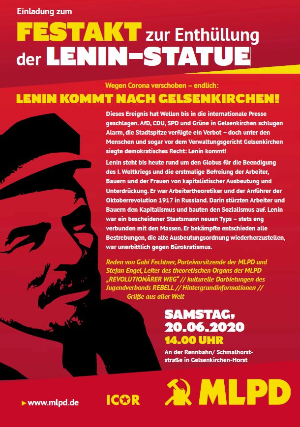 Vordergrundbild z.B. ein Screenshot des Flugblattes Hintergrundbild z.B. ein Foto 319 * 177 Pixel breit Text kurzer Anreißer z.B. "Erklärung des Zentralkomitees der MLPD: Aktiver Widerstand gegen imperialistische Kriegsvorbereitung!" Samstag, 20.06., 14 Uhr: Festakt zur Enthüllung der Lenin-Statue Buttontext z.B. "Flugblatt lesen" Flyer lesen Buttonlink z.B. "2018/kw14/dieses-flugblatt-in-pdf-format-in-farbe" 2020/05/flyer-festakt_leninstatue_20-juni.pdf/ Inhalte Dieser Ordner hat zur Zeit keinen Inhalt.