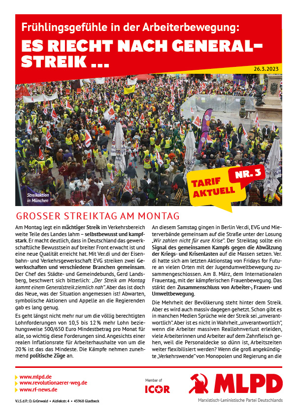 Vordergrundbild z.B. ein Screenshot des Flugblattes Hintergrundbild z.B. ein Foto 319 * 177 Pixel breit Text kurzer Anreißer z.B. "Erklärung des Zentralkomitees der MLPD: Aktiver Widerstand gegen imperialistische Kriegsvorbereitung!" Frühlingsgefühle in der Arbeiterbewegung: Es riecht nach Generalstreik Buttontext z.B. "Flugblatt lesen" Flugblatt lesen Buttonlink z.B. "2018/kw14/dieses-flugblatt-in-pdf-format-in-farbe" 2023/03/es-riecht-nach-generalstreik Inhalte Dieser Ordner hat zur Zeit keinen Inhalt.