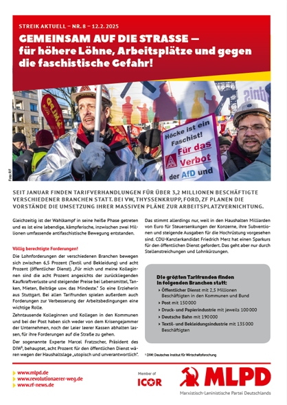 Vordergrundbild z.B. ein Screenshot des Flugblattes Hintergrundbild z.B. ein Foto 319 * 177 Pixel breit Text kurzer Anreißer z.B. "Erklärung des Zentralkomitees der MLPD: Aktiver Widerstand gegen imperialistische Kriegsvorbereitung!" Streik Aktuell 8: Gemeinsam auf die Straße – für höhere Löhne, Arbeitsplätze und gegen die faschistische Gefahr! Buttontext z.B. "Flugblatt lesen" Flugblatt lesen Buttonlink z.B. "2018/kw14/dieses-flugblatt-in-pdf-format-in-farbe" 2025/02/gemeinsam-auf-die-strasse-fuer-hoehere-loehne-arbeitsplaetze-und-gegen-die-faschistische-gefahr Inhalte Dieser Ordner hat zur Zeit keinen Inhalt.