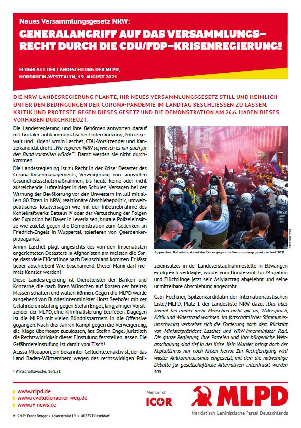 Vordergrundbild z.B. ein Screenshot des Flugblattes Hintergrundbild z.B. ein Foto 319 * 177 Pixel breit Text kurzer Anreißer z.B. "Erklärung des Zentralkomitees der MLPD: Aktiver Widerstand gegen imperialistische Kriegsvorbereitung!" Generalangriff auf das Versammlungsrecht durch die CDU/FDP-Krisenregierung! Buttontext z.B. "Flugblatt lesen" Flugblatt lesen Buttonlink z.B. "2018/kw14/dieses-flugblatt-in-pdf-format-in-farbe" https://www.mlpd.de/2021/08/generalangriff-auf-das-versammlungsrecht-durch-die-cdu-fdp-krisenregierung Inhalte Dieser Ordner hat zur Zeit keinen Inhalt.