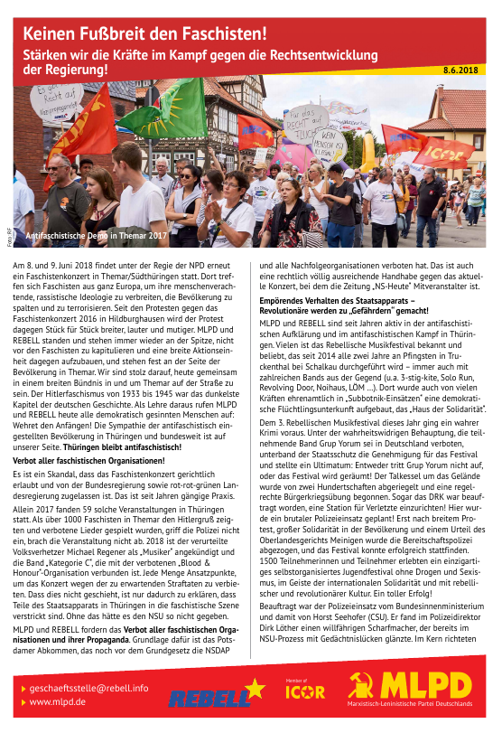 Vordergrundbild z.B. ein Screenshot des Flugblattes Hintergrundbild z.B. ein Foto 319 * 177 Pixel breit Text kurzer Anreißer z.B. "Erklärung des Zentralkomitees der MLPD: Aktiver Widerstand gegen imperialistische Kriegsvorbereitung!" Flugblatt des Zentralkomitees der MLPD anlässlich der antifaschistischen Proteste gegen ein Neonazikonzert in Themar (Thüringen) Buttontext z.B. "Flugblatt lesen" Flugblatt lesen Buttonlink z.B. "2018/kw14/dieses-flugblatt-in-pdf-format-in-farbe" https://www.rf-news.de/2018/kw23/180608_flugblatt-themar_farbe.pdf Inhalte Dieser Ordner hat zur Zeit keinen Inhalt.