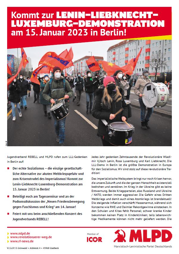 Vordergrundbild z.B. ein Screenshot des Flugblattes Hintergrundbild z.B. ein Foto 319 * 177 Pixel breit Text kurzer Anreißer z.B. "Erklärung des Zentralkomitees der MLPD: Aktiver Widerstand gegen imperialistische Kriegsvorbereitung!" Kommt zur Lenin-Liebknecht-Luxemburg-Demonstration am 15. Januar 2023 in Berlin Buttontext z.B. "Flugblatt lesen" Aufruf lesen Buttonlink z.B. "2018/kw14/dieses-flugblatt-in-pdf-format-in-farbe" 2023/01/kommt-zur-lenin-liebknecht-luxemburg-demonstration-am-15-januar-2023-in-berlin Inhalte Dieser Ordner hat zur Zeit keinen Inhalt.