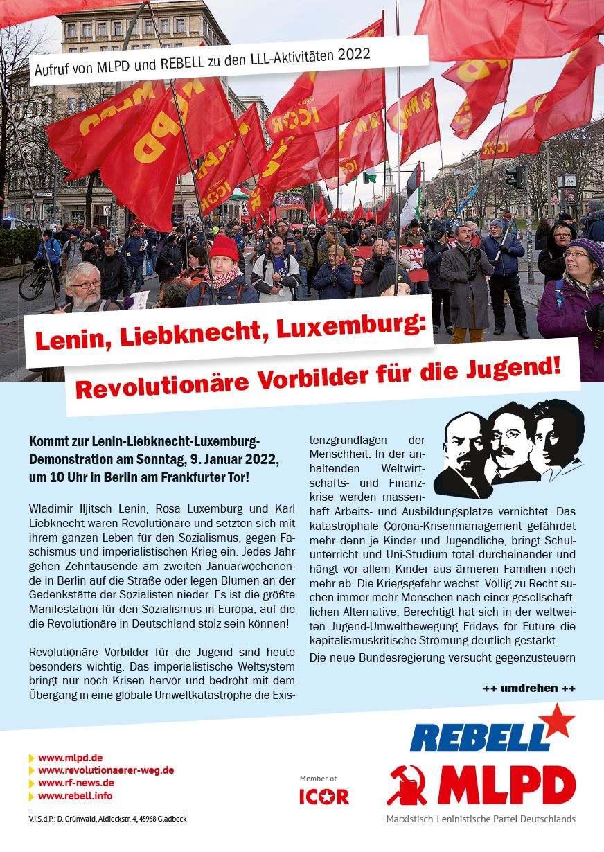 Vordergrundbild z.B. ein Screenshot des Flugblattes Hintergrundbild z.B. ein Foto 319 * 177 Pixel breit Text kurzer Anreißer z.B. "Erklärung des Zentralkomitees der MLPD: Aktiver Widerstand gegen imperialistische Kriegsvorbereitung!" Lenin, Liebknecht, Luxemburg: Revolutionäre Vorbilder für die Jugend! Buttontext z.B. "Flugblatt lesen" Flugblatt lesen Buttonlink z.B. "2018/kw14/dieses-flugblatt-in-pdf-format-in-farbe" 2022/01/lenin-liebknecht-luxemburg-revolutionaere-vorbilder-fuer-die-jugend Inhalte Dieser Ordner hat zur Zeit keinen Inhalt.