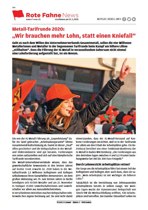 Vordergrundbild z.B. ein Screenshot des Flugblattes Hintergrundbild z.B. ein Foto 319 * 177 Pixel breit Text kurzer Anreißer z.B. "Erklärung des Zentralkomitees der MLPD: Aktiver Widerstand gegen imperialistische Kriegsvorbereitung!" Metall-Tarifrunde 2020: „Wir brauchen mehr Lohn, statt einen Kniefall“ Buttontext z.B. "Flugblatt lesen" Flugblatt lesen Buttonlink z.B. "2018/kw14/dieses-flugblatt-in-pdf-format-in-farbe" 2020/03/metal-tarifrunde.pdf Inhalte Dieser Ordner hat zur Zeit keinen Inhalt.
