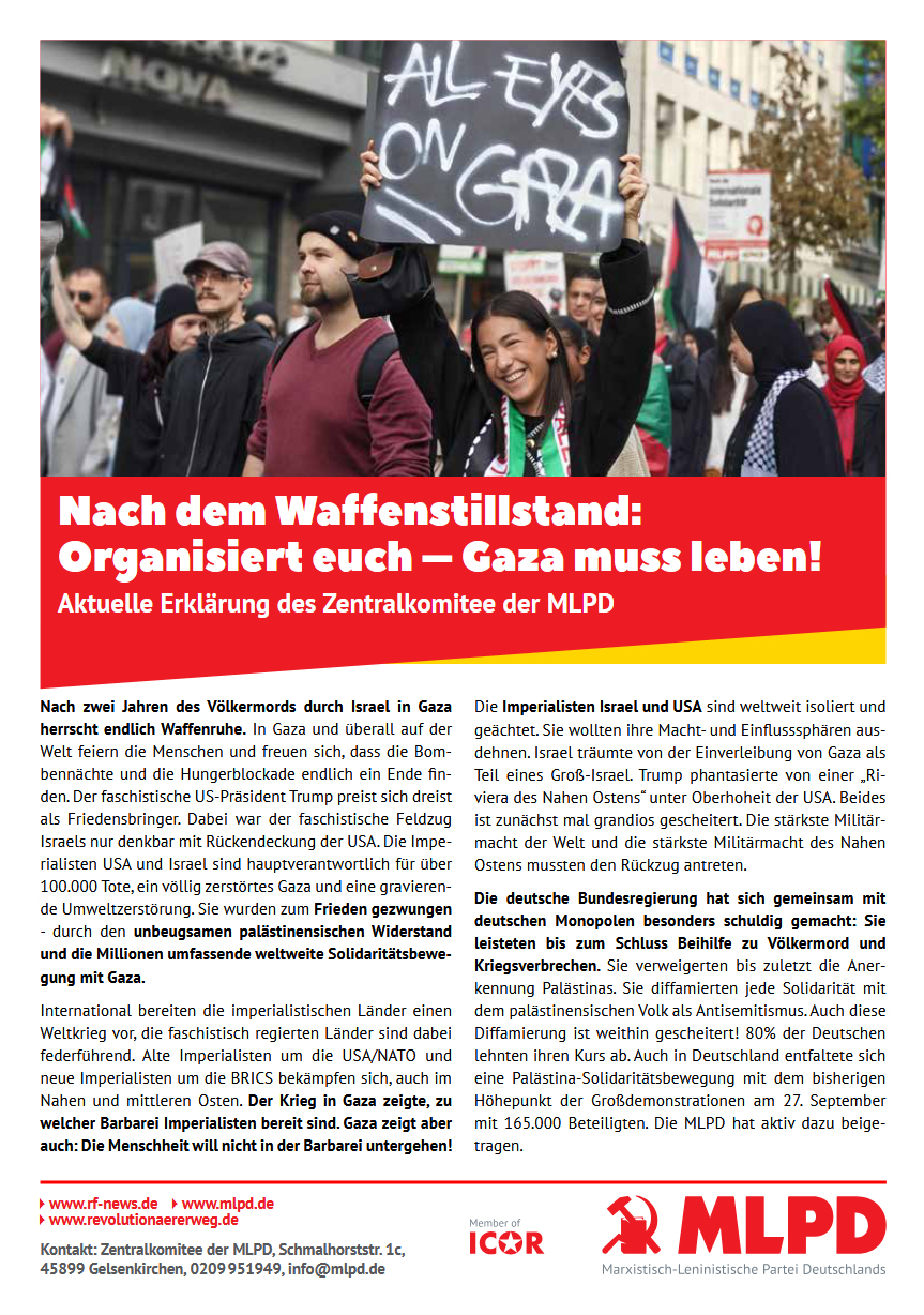 Vordergrundbild z.B. ein Screenshot des Flugblattes Hintergrundbild z.B. ein Foto 319 * 177 Pixel breit Text kurzer Anreißer z.B. "Erklärung des Zentralkomitees der MLPD: Aktiver Widerstand gegen imperialistische Kriegsvorbereitung!" Nach dem Waffenstillstand: Organisiert euch – Gaza muss leben! Buttontext z.B. "Flugblatt lesen" Flugblatt lesen Buttonlink z.B. "2018/kw14/dieses-flugblatt-in-pdf-format-in-farbe" 2025/10/nach-dem-waffenstillstand-organisiert-euch-gaza-muss-leben Inhalte Dieser Ordner hat zur Zeit keinen Inhalt.