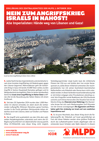 Vordergrundbild z.B. ein Screenshot des Flugblattes Hintergrundbild z.B. ein Foto 319 * 177 Pixel breit Text kurzer Anreißer z.B. "Erklärung des Zentralkomitees der MLPD: Aktiver Widerstand gegen imperialistische Kriegsvorbereitung!" Nein zum Angriffskrieg Israels in Nahost! Buttontext z.B. "Flugblatt lesen" Flugblatt lesen Buttonlink z.B. "2018/kw14/dieses-flugblatt-in-pdf-format-in-farbe" 2024/10/nein-zum-angriffskrieg-israels-in-nahost Inhalte Dieser Ordner hat zur Zeit keinen Inhalt.