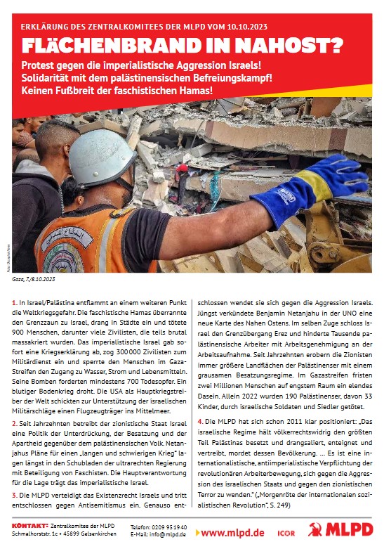 Vordergrundbild z.B. ein Screenshot des Flugblattes Hintergrundbild z.B. ein Foto 319 * 177 Pixel breit Text kurzer Anreißer z.B. "Erklärung des Zentralkomitees der MLPD: Aktiver Widerstand gegen imperialistische Kriegsvorbereitung!" Protest gegen die imperialistische Aggression Israels! Solidarität mit dem palästinensischen Befreiungskampf! Keinen Fußbreit der faschistischen Hamas! Buttontext z.B. "Flugblatt lesen" Flugblatt lesen Buttonlink z.B. "2018/kw14/dieses-flugblatt-in-pdf-format-in-farbe" 2023/10/protest-gegen-die-imperialistische-aggression-israels-solidaritaet-mit-dem-palaestinensischen-befreiungskampf-keinen-fussbreit-der-faschistischen-hamas Inhalte Dieser Ordner hat zur Zeit keinen Inhalt.