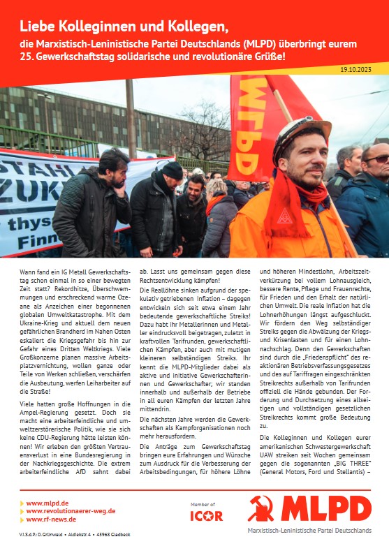 Vordergrundbild z.B. ein Screenshot des Flugblattes Hintergrundbild z.B. ein Foto 319 * 177 Pixel breit Text kurzer Anreißer z.B. "Erklärung des Zentralkomitees der MLPD: Aktiver Widerstand gegen imperialistische Kriegsvorbereitung!" Solidarische und revolutionäre Grüße an den Gewerkschaftstag! Buttontext z.B. "Flugblatt lesen" Flugblatt lesen Buttonlink z.B. "2018/kw14/dieses-flugblatt-in-pdf-format-in-farbe" 2023/10/ig-metall-gewerkschaftstag.pdf Inhalte Dieser Ordner hat zur Zeit keinen Inhalt.