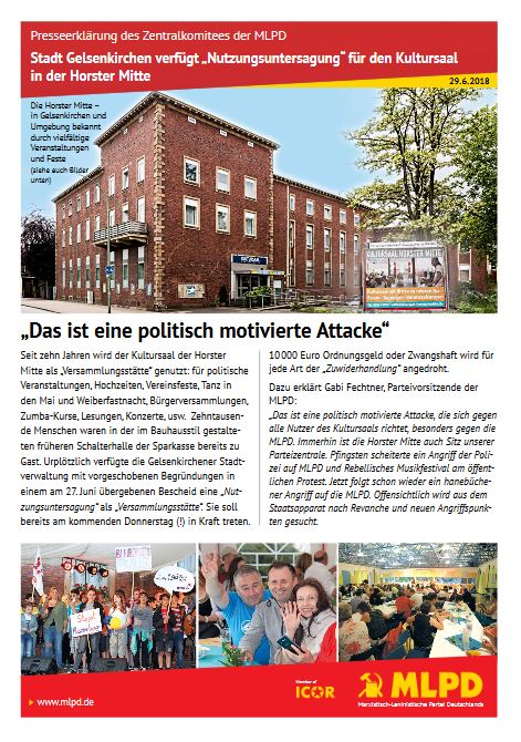 Vordergrundbild z.B. ein Screenshot des Flugblattes Hintergrundbild z.B. ein Foto 319 * 177 Pixel breit Text kurzer Anreißer z.B. "Erklärung des Zentralkomitees der MLPD: Aktiver Widerstand gegen imperialistische Kriegsvorbereitung!" Presseerklärung des Zentralkomitees der MLPD: Stadt Gelsenkirchen verfügt „Nutzungsuntersagung" für den Kultursaal in der Horster Mitte Buttontext z.B. "Flugblatt lesen" Flugblatt lesen Buttonlink z.B. "2018/kw14/dieses-flugblatt-in-pdf-format-in-farbe" https://www.mlpd.de/2018/kw26/180629%20Flugblatt%20MLPD%20gegen%20Nutzungsverbot%20Kultursaal.pdf Inhalte Dieser Ordner hat zur Zeit keinen Inhalt.