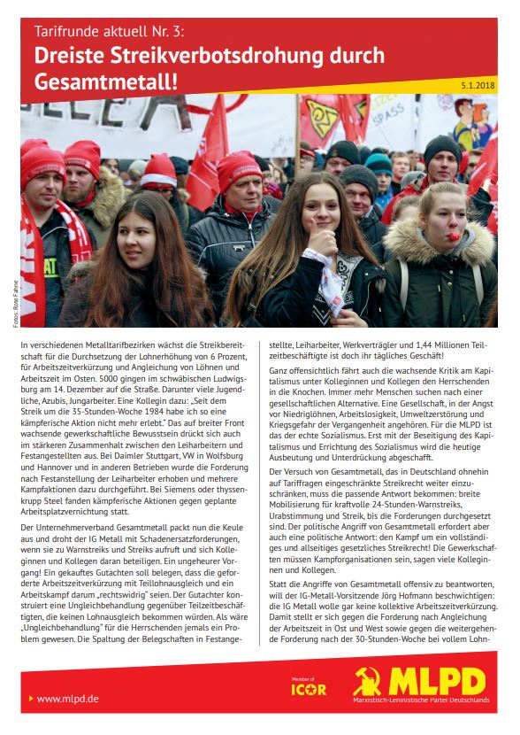 Vordergrundbild z.B. ein Screenshot des Flugblattes Hintergrundbild z.B. ein Foto 319 * 177 Pixel breit Text kurzer Anreißer z.B. "Erklärung des Zentralkomitees der MLPD: Aktiver Widerstand gegen imperialistische Kriegsvorbereitung!" Tarifrunde aktuell Nr. 3: Dreiste Streikverbotsdrohung durch Gesamtmetall! Buttontext z.B. "Flugblatt lesen" Flugblatt lesen Buttonlink z.B. "2018/kw14/dieses-flugblatt-in-pdf-format-in-farbe" 2018/kw02/tarifrunde-aktuell-nr-3.pdf Inhalte Dieser Ordner hat zur Zeit keinen Inhalt.