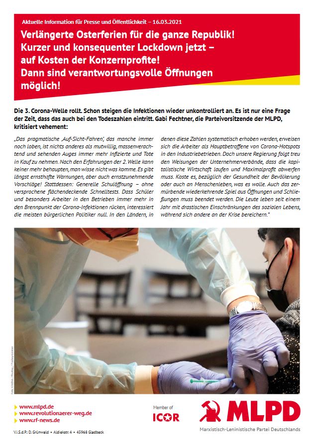 Vordergrundbild z.B. ein Screenshot des Flugblattes Hintergrundbild z.B. ein Foto 319 * 177 Pixel breit Text kurzer Anreißer z.B. "Erklärung des Zentralkomitees der MLPD: Aktiver Widerstand gegen imperialistische Kriegsvorbereitung!" Verlängerte Osterferien für die ganze Republik! Kurzer und konsequenter Lockdown jetzt - auf Kosten der Konzernprofite! Buttontext z.B. "Flugblatt lesen" Flugblatt lesen Buttonlink z.B. "2018/kw14/dieses-flugblatt-in-pdf-format-in-farbe" 2021/03/210318-konzentrierter-lockdown.pdf Inhalte Dieser Ordner hat zur Zeit keinen Inhalt.