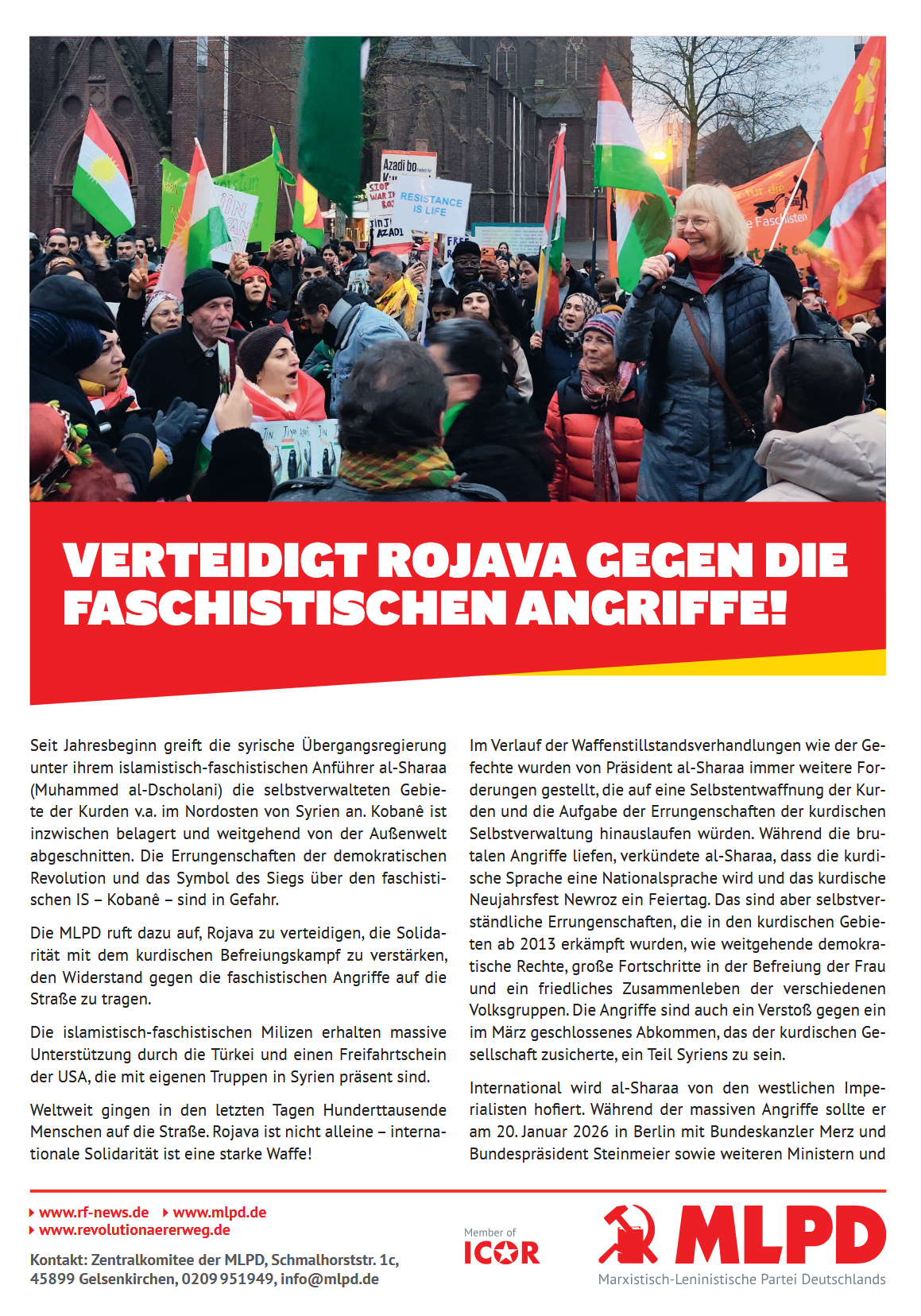 Vordergrundbild z.B. ein Screenshot des Flugblattes Hintergrundbild z.B. ein Foto 319 * 177 Pixel breit Text kurzer Anreißer z.B. "Erklärung des Zentralkomitees der MLPD: Aktiver Widerstand gegen imperialistische Kriegsvorbereitung!" Verteidigt Rojava gegen die faschistischen Angriffe Buttontext z.B. "Flugblatt lesen" Flugblatt lesen Buttonlink z.B. "2018/kw14/dieses-flugblatt-in-pdf-format-in-farbe" 2026/01/verteidigt-rojava-gegen-die-faschistischen-angriffe Inhalte Dieser Ordner hat zur Zeit keinen Inhalt.